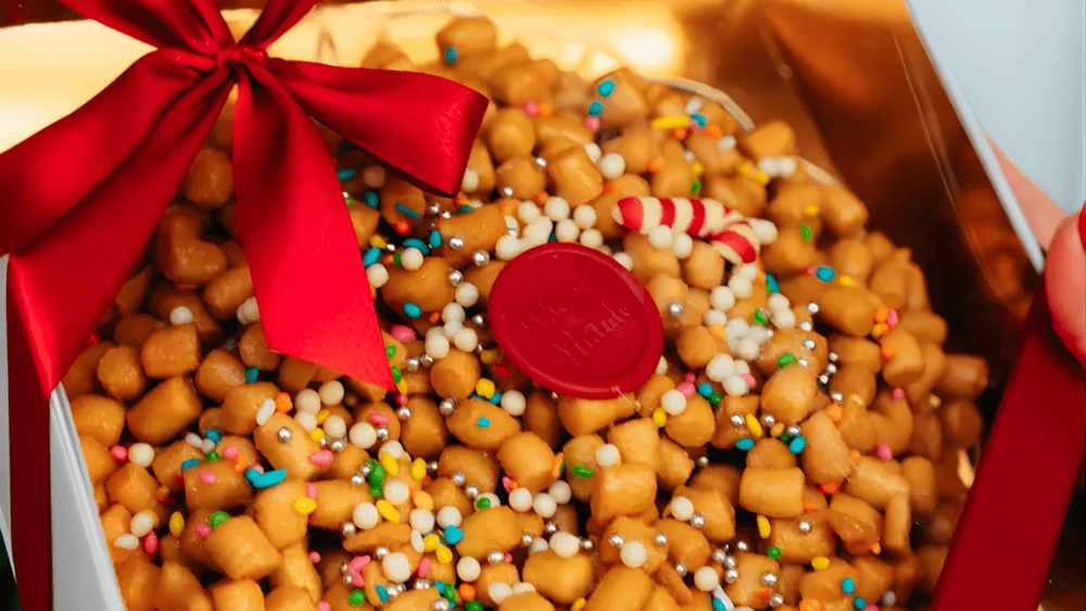 Depois de um dia de descanso, os pequenos bocados fritos são envolvidos em mel de millefiori, escolhido pela confeiteira por ser menos invasivo ao paladar que o mel de acácia. Por cima, a chuva de anis colorido e pérolas de chocolate francês — uma homenagem à sua segunda pátria profissional, a França — confere graça visual e contraste de texturas, sem jamais cair no excesso.