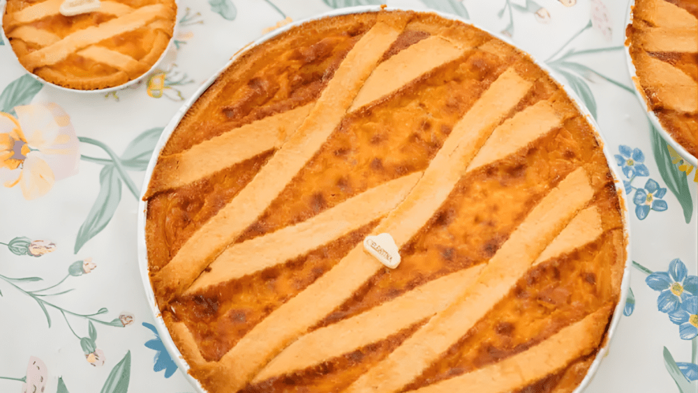 A frolla, preparada à mão com strutto, açúcar, ovo, farinhas e cítricos, acolhe um recheio perfumado de grão cozido em leite com baunilha, ricota, açúcar, ovos e scorzette de laranja. Por fim, as tiras de massa cruzadas sobre a superfície não são mero ornamento: remetem aos decumani da cidade, traçando, na própria sobremesa, a topografia afetiva de Nápoles.